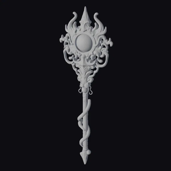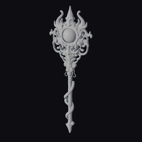 Standing tall with its sharp, tapered tip, this ornate staff showcases a mesmerizing blend of purple, blue, and copper hues. The central purple orb glows with an ethereal light, surrounded by intricate, curved metalwork that adds a sense of dynamic movement. The staff’s body is adorned with spiraling copper and blue details, creating a sense of fluidity and mystique. Ideal for use in games, animations, or 3D prints, this model brings a touch of magic to any fantasy setting.