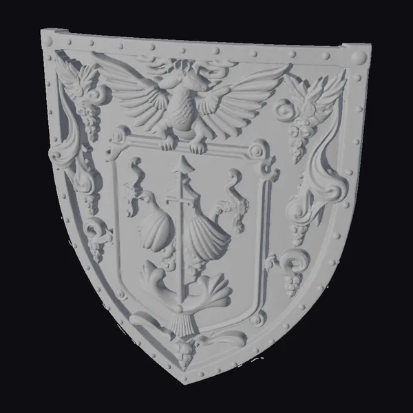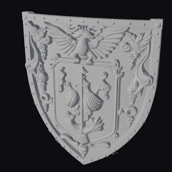 This stunning shield emblem boasts a vibrant red background, expertly complemented by intricate gold details that dance across its surface. The embossed family crest features a majestic eagle at the top, surrounded by ornate flourishes and a stylized shield at its center. The shield’s curved shape and pointed bottom are classic elements of medieval design, while the gold accents add a sense of opulence. Whether you’re a historian, a gamer, or simply someone who appreciates the finer things in life, this shield emblem is sure to impress. Its detailed textures and realistic lighting make it perfect for use in games, 3D printing, VR/AR experiences, animation, and design projects.