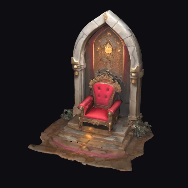 Perched atop a raised platform, this exquisite throne commands attention with its vibrant red upholstery and gold filigree. The chair’s tufted back and armrests are meticulously crafted, complemented by the arch’s subtle glow and ornate stonework. As light dances across the scene, the throne’s majesty is palpable. Ideal for games, animation, or VR/AR experiences, this model transports users to realms of fantasy and power. Designers and artists will appreciate the level of detail, from the throne’s carved wooden frame to the delicate textures of the stone floor.