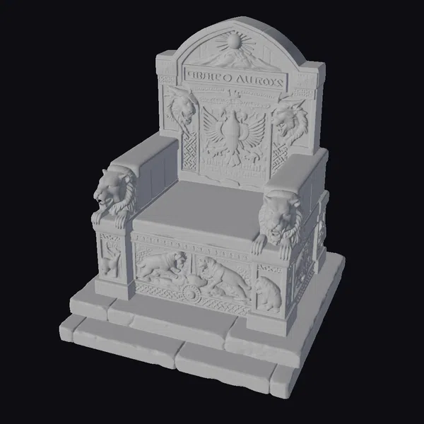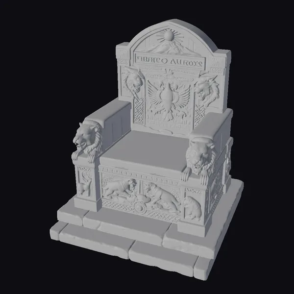 Positioned proudly on a stepped stone base, the throne’s imposing structure is a marvel of detailed craftsmanship. The armrests are flanked by fierce lion heads, their mouths open in a perpetual roar, while the front panels showcase a dynamic scene of battling beasts. The backrest features an elaborate design, complete with a central emblem and the inscription ‘LIBERO AUTTOXX’ beneath a radiant sun motif. This throne’s grandeur makes it a perfect centerpiece for projects requiring a touch of epic fantasy, suitable for use in games, 3D printing, VR/AR experiences, animation, and design projects where a statement piece is needed.