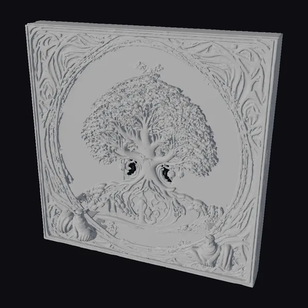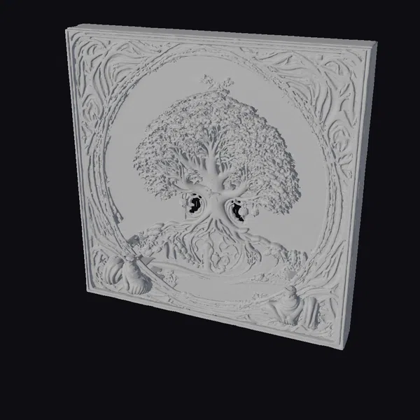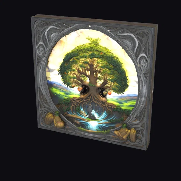 This exquisite tree portrait showcases a tree with a lush, green canopy and extensive roots that glow with a soft, ethereal light. The tree stands proudly in a beautiful, vibrant landscape, complete with rolling hills and a radiant sky. The entire scene is encased in an intricately carved, ornate frame that adds to the piece’s mystique. The level of detail is exceptional, from the texture of the tree’s bark to the delicate foliage. This model is perfect for use in games, 3D printing, VR/AR experiences, animation, and design projects where a touch of fantasy and magic is desired.