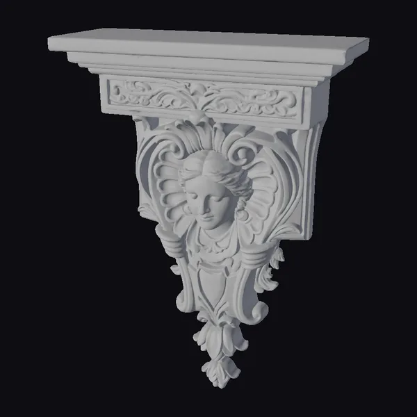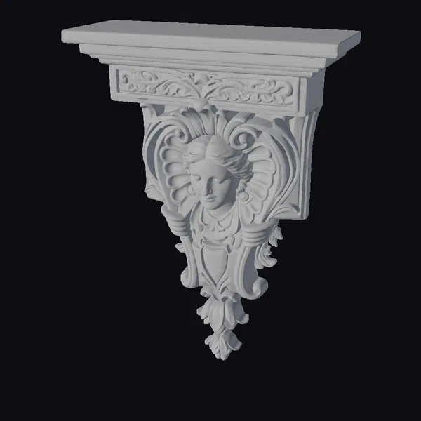 Positioned dynamically against a crisp white backdrop, the ornate wall bracket shelf showcases its richly detailed design. The shelf’s top surface features a warm, mottled brown finish, while the bracket itself is adorned with golden and green hues, accentuating its ornate carvings. A beautifully crafted face is nestled within the bracket’s center, framed by flowing, petal-like designs that add to the piece’s stylized allure. Ideal for adding a touch of sophistication to games, 3D environments, or architectural visualizations, this model is versatile for various applications including print, VR/AR experiences, and animation projects. Its unique blend of functionality and decorative appeal makes it a standout element in any design.