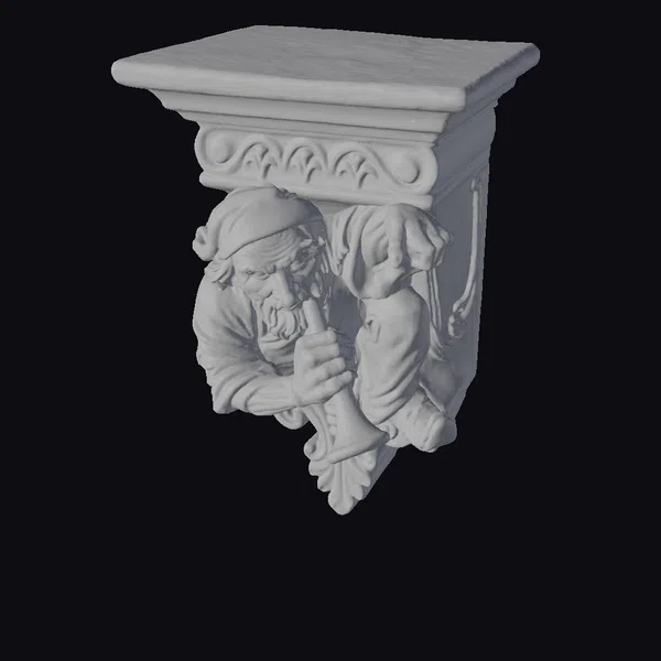 Perched on a sturdy base adorned with lush scrollwork, the wooden console table appears to be supported by a fantastical figure – an elderly man donning a vibrant red and orange headscarf, a flowing green robe, and a thoughtful expression. As he plays a golden pipe, his fingers seem to dance in mid-air, imbuing the piece with a sense of movement. The tabletop itself showcases a smooth, warm wood grain, while the carved support is a masterful blend of earthy tones, golden accents, and soft pastels. This ornate console table would be a stunning addition to any room, perfect for designers and artists seeking to infuse their projects with a touch of magic. Ideal for 3D rendering, animation, or print-on-demand applications.