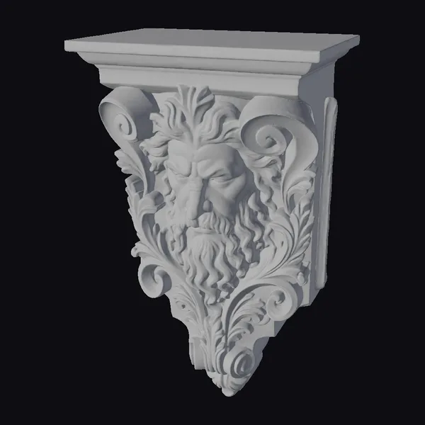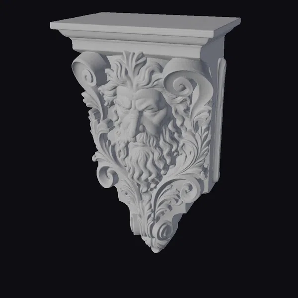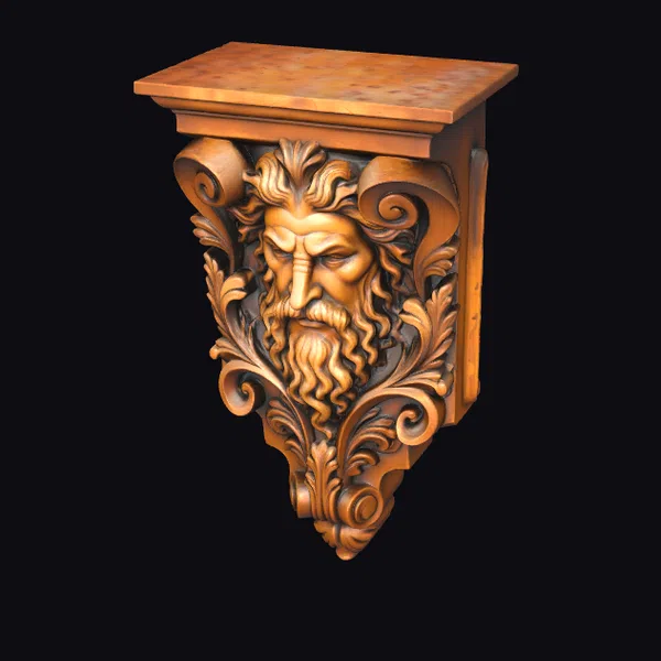 Perched atop a sturdy base, this beautifully crafted console table features a carved wooden face with a long beard and flowing hair, surrounded by delicate leaves and scrollwork. The intricate details and textures of the wood grain are meticulously rendered, inviting the viewer to appreciate the artisan’s skill. The table’s surface boasts a subtle, mottled pattern, adding depth and visual interest. Ideal for use in interior design, architecture, and animation projects, this stunning piece can bring a touch of classic elegance to any setting.