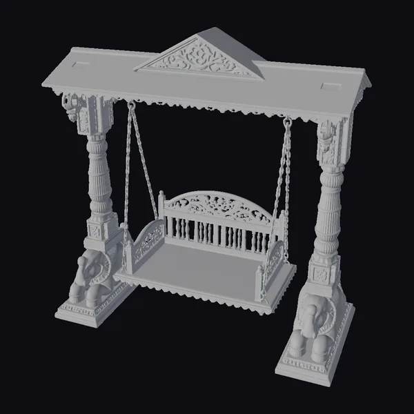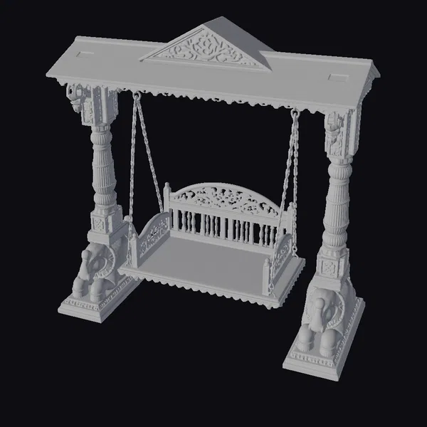 Positioned regally on elephant-shaped pedestals, the ornate wooden swing boasts a sturdy frame with a peaked roof, intricately carved with floral patterns and supported by ornate pillars. The swing’s seat, adorned with delicate carvings, hangs from sturdy chains, promising a serene experience. Its warm, honey-brown wood grain glistens, accentuating the craftsmanship. Ideal for adding a touch of classic elegance to games, 3D environments, or animations, this model brings a sense of nostalgia and tranquility. Designers can integrate it into scenes requiring traditional or vintage settings, leveraging its detailed textures and authentic design.