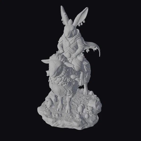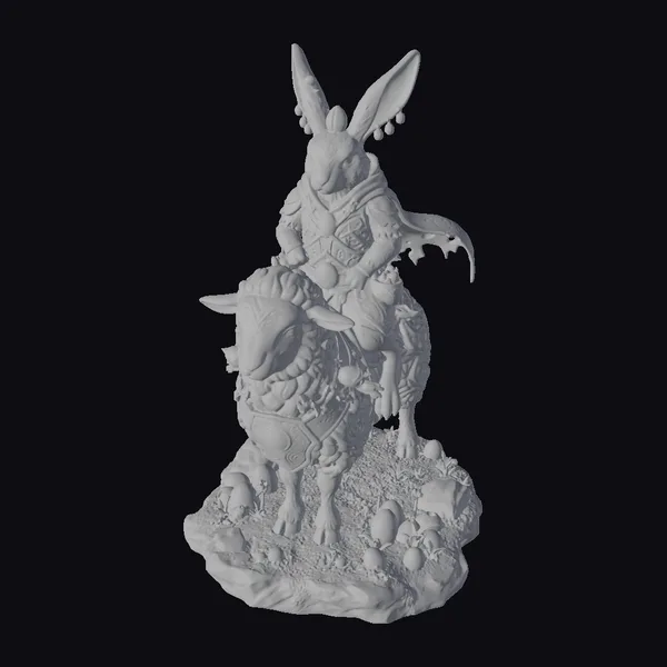 In a scene that captures the essence of spring and renewal, a fantastical rabbit rider sits confidently on a stately white sheep. The rider’s armor shines with a mix of gold and green hues, complemented by a flowing cape that adds a sense of movement. The rabbit’s ears are uniquely adorned with pearls, adding to its mystical aura. The sheep, with its detailed wool and serene expression, is festively decorated with garlands and eggs, symbolizing the joy of Easter. The base, covered in vibrant green moss and scattered with colorful eggs, completes this enchanting tableau. Ideal for games, animation, or as a decorative piece, this model brings a touch of fantasy and celebration to any project.