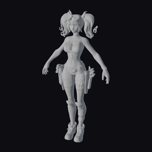 Standing tall with her arms outstretched, this paintball warrior exudes confidence and readiness for battle. Her stylized design combines functionality with a bold fashion statement, featuring a predominantly blue and purple outfit accented with pink and gray. The metal armor on her thighs and the goggles perched on her forehead add a utilitarian edge to her look, while her orange hair, styled in twin ponytails, injects a playful touch. This model is perfect for projects requiring a character that embodies both style and a readiness for action, such as video games, animations, or virtual reality experiences.