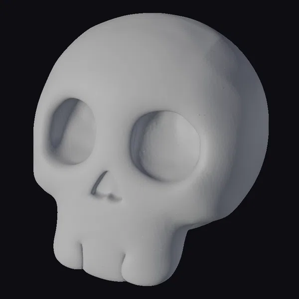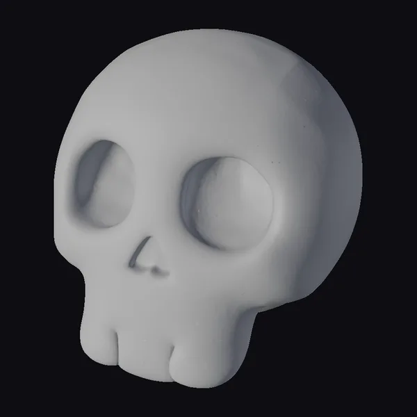 This stylized skull head boasts a pale, almost creamy complexion that seems to glow with an otherworldly light. The smooth texture and rounded edges give it a toy-like quality, while the large black eye sockets and small triangular nose create a striking contrast. The skull’s proportions are slightly exaggerated, with a larger-than-usual cranium and a small, button-like jaw. The overall effect is one of haunting simplicity, as if this skull might be a character from a dark fairy tale or a minimalist’s take on the macabre. Use it to add a touch of whimsy to your 3D designs, or as a thought-provoking element in your artwork. Its simplicity makes it versatile for various applications, from games and animation to print and VR/AR experiences.