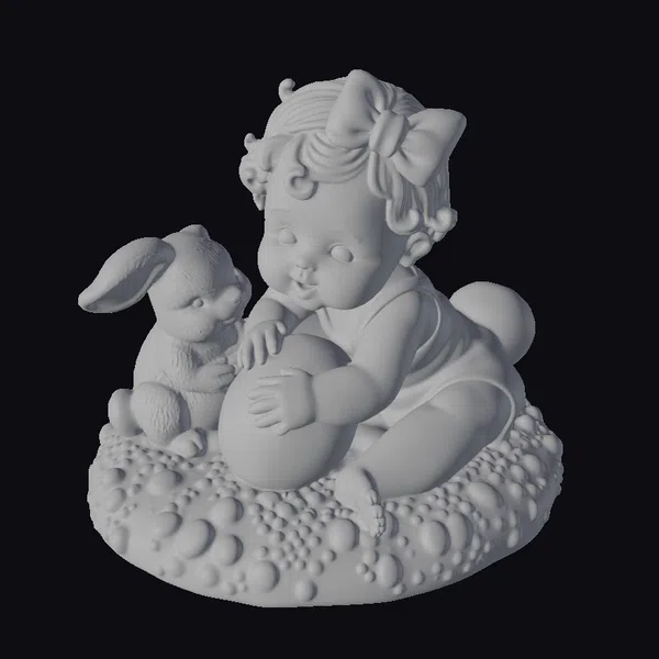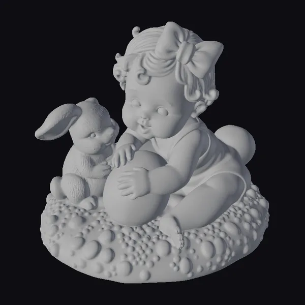 Deep in a world of vibrant colors and playful imagination, a little baby girl with curly blonde hair and a large pink bow takes center stage. She’s dressed in a mint green romper and is playfully interacting with a large, multi-colored Easter egg, her hands gently touching its pastel surface. By her side, a white bunny with pink inner ears and a bright red nose watches with curiosity, adding a sense of companionship to the scene. The duo is positioned on a round base that resembles a cluster of small stones or bubbles, providing a unique textural contrast to the smooth, cartoon-style characters. The overall scene exudes a sense of joy and innocence, perfect for Easter or spring-themed projects. Whether you’re creating content for games, animations, or 3D printing, this model brings a burst of Easter cheer with its detailed textures, from the baby’s rosy cheeks to the bunny’s fluffy fur.