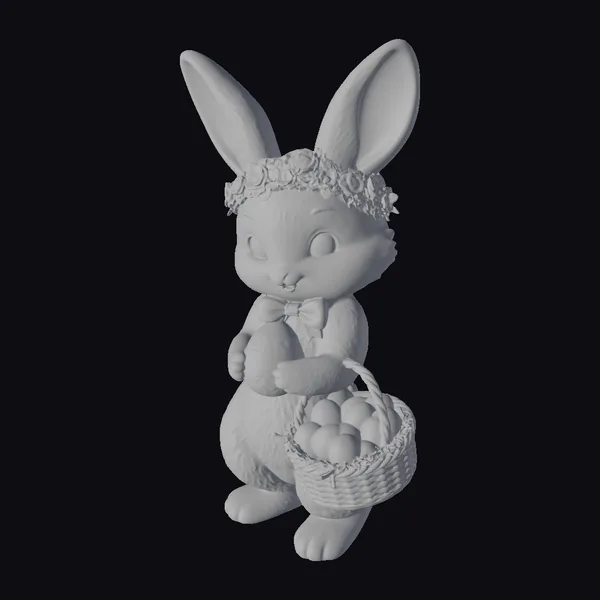 Detailed with precision, this stylized Easter bunny stands out with its oversized ears and endearing facial features. The bunny’s soft, pastel-colored fur is complemented by a beautiful floral crown, adding a touch of elegance. It holds a wicker basket overflowing with colorful eggs, each one uniquely patterned. The scene is set against a clean white background, emphasizing the bunny’s sweet expression and the vibrant colors of the eggs. Ideal for Easter-themed projects, spring celebrations, or as a delightful addition to 3D scenes, this model is versatile and visually appealing. Its high-quality details make it suitable for close-up shots in animations, games, or 3D renderings.