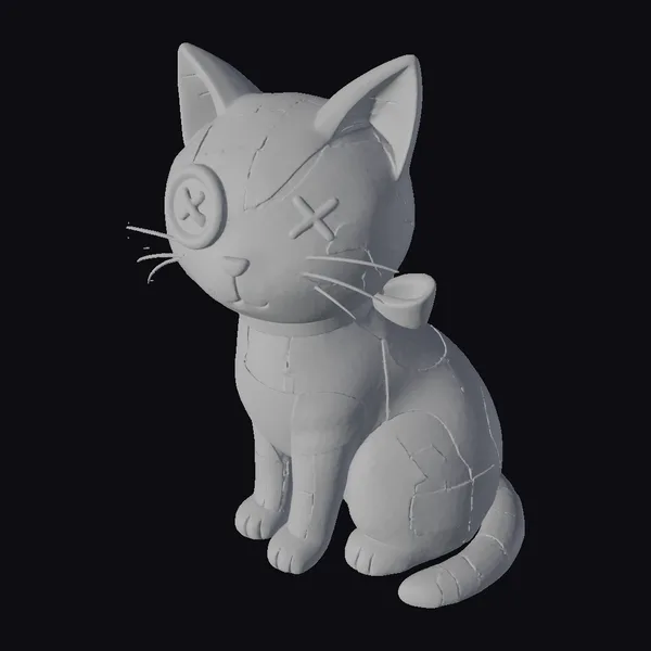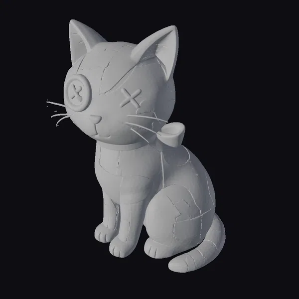 Detailed visual breakdown reveals a sitting cat with a body composed of various colorful fabric patches, meticulously stitched together. The eyes are large, circular purple buttons with black X’s, adding a quirky touch. A small purple collar encircles its neck, complementing the multicolored texture. This stylized model showcases intricate details such as stitched seams and textured fabric. Ideal for use in games, 3D printing, VR/AR experiences, animation, and design projects where a whimsical touch is desired.