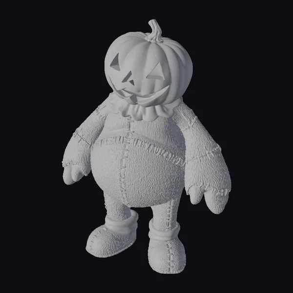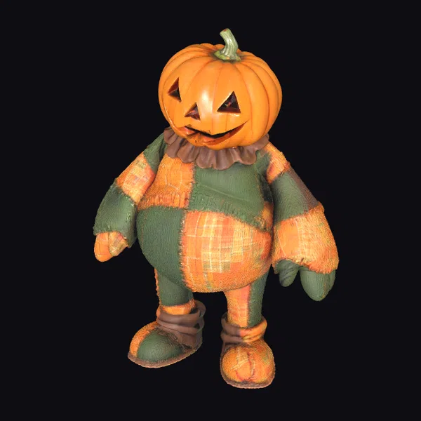 Standing with a gentle posture, this stylized scarecrow features a pumpkin head with a carved, smiling face. The body is clad in a colorful patchwork costume, combining green and orange tones, with a brown ruffled collar and matching boots. The model’s details, from the stitched seams on the costume to the texture of the pumpkin, are meticulously rendered. The character’s friendly demeanor makes it perfect for use in Halloween-themed projects, animations, or games. Its unique design ensures it will be a standout in any scene.