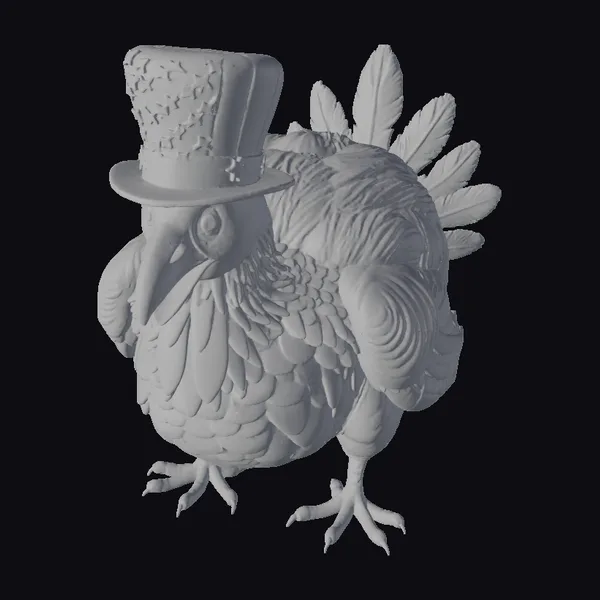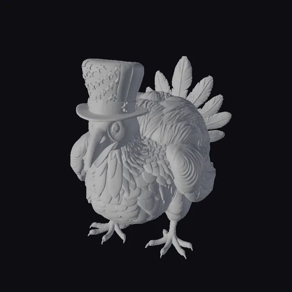 Gazing at this model, you’ll notice the turkey’s dynamic pose, with its head turned slightly to the side and its top hat tilted at a rakish angle. The model’s textures showcase a range of warm, earthy tones, from the soft cream of its breast to the deep oranges of its feathers. The top hat, adorned with white stars on a blue background and red-and-white stripes, adds a touch of whimsy and patriotism. This model would be perfect for use in animations, games, or 3D printing projects related to Thanksgiving or American culture.