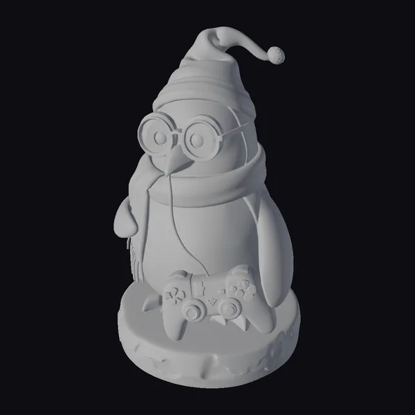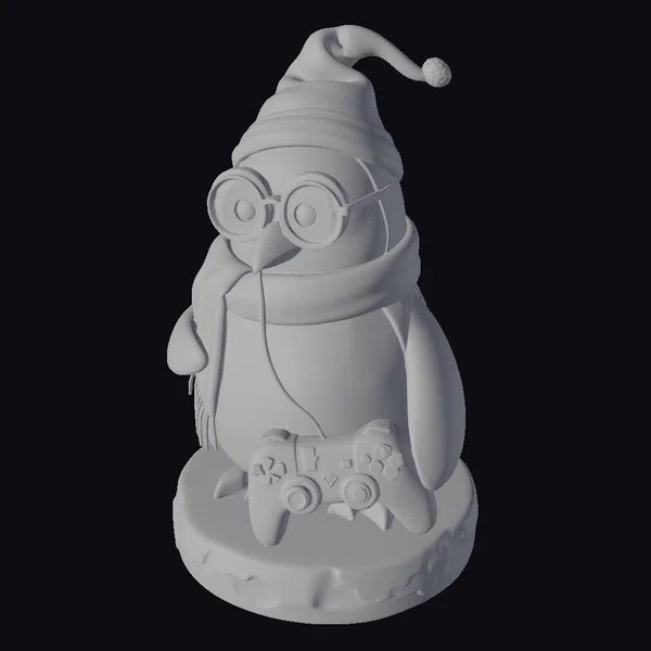 Detailed with precision, this penguin model is posed in a majestic stance, donning a black and orange striped hat and scarf, along with round glasses perched on its beak. The penguin grasps a black Xbox controller with its orange feet, adding a modern twist to its wizarding attire. The model sits atop a beige base, which subtly resembles stone or ice, providing a sturdy foundation. Textures are smooth and slightly cartoonish, enhancing the overall stylized feel. The lighting highlights the penguin’s white and black feathers, the glossy controller, and the intricate details of its costume. This model is ideal for use in games, animations, or as a quirky decorative piece, offering a unique blend of fantasy and modern gaming culture.