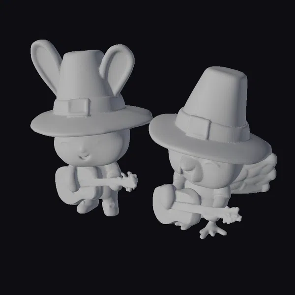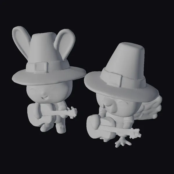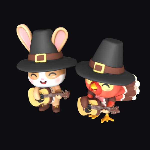 Detailed with precision, these 3D cartoon characters showcase a bunny and a turkey, each wearing a classic pilgrim hat adorned with a shiny gold buckle. The bunny has large, perky ears and a happy face, while the turkey sports a more subdued expression. Both characters hold guitars, capturing a moment of musical camaraderie. Their textures are smooth and vibrant, with the pilgrim hats and guitars adding a rich, detailed element to their design. These characters are ideal for animations, games, or any creative project requiring a lighthearted and festive feel. They can be used in various applications such as print media, virtual reality experiences, or as decorative elements in digital environments.