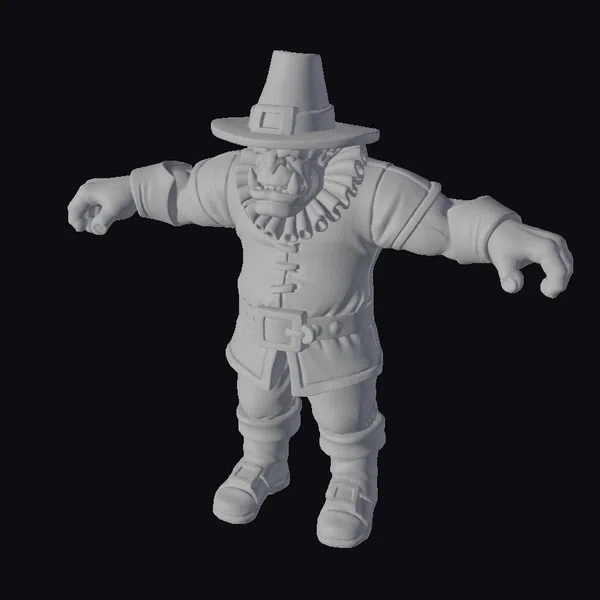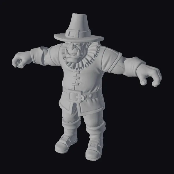 Detailed with precision, this stylized ogre pilgrim model showcases intricate textures and a dynamic pose, perfect for bringing a unique flair to games, animations, or 3D prints. The character’s green skin contrasts sharply with the traditional black pilgrim outfit, complete with a hat, ruffled collar, and buckled shoes. The ogre’s sharp teeth and outstretched arms convey a sense of playful aggression, making this model a standout addition to any project. Whether you’re working on a Thanksgiving-themed project or simply looking for a quirky character, this ogre pilgrim is sure to delight.