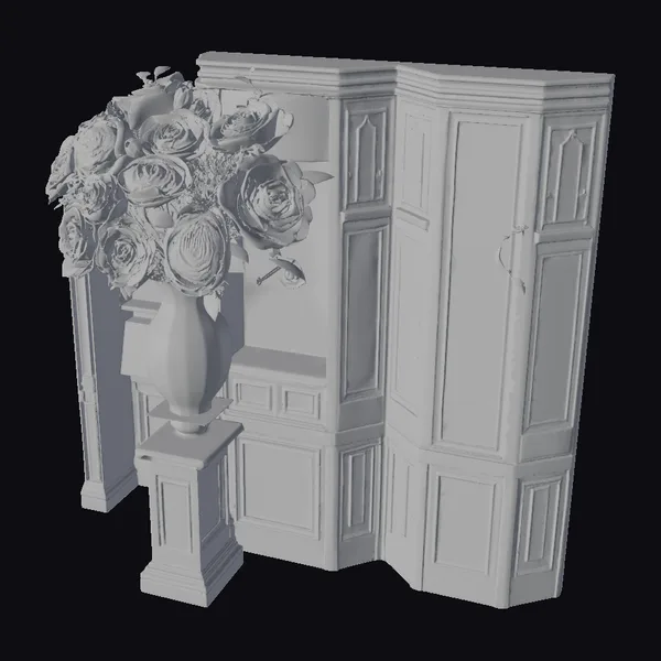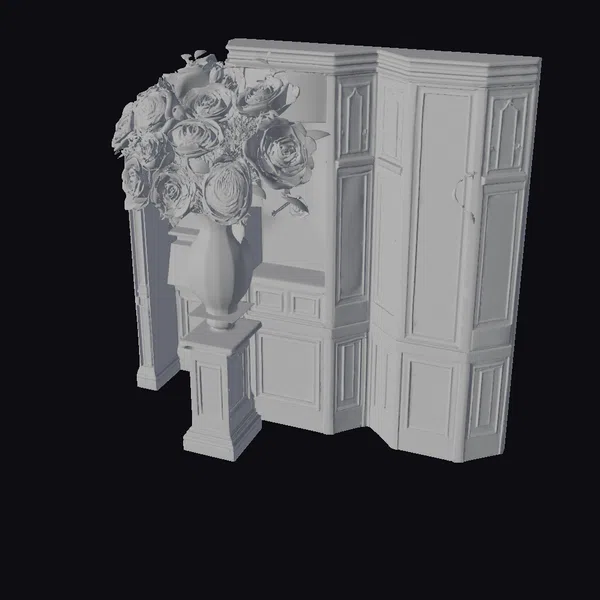 Gaze upon the intricate details of this exquisite pink alcove, complete with golden accents and white trim that frame its soft, blush-colored panels. A gorgeous bouquet of white roses spills out of a beautiful vase, which rests on a small pedestal in front of the alcove. The vase itself features a charming floral pattern, adding an extra layer of visual interest to the arrangement. The alcove’s design is characterized by its raised panels and ornate details, creating a sense of depth and dimensionality. This 3D model would be perfect for interior design projects, architectural visualizations, or even animation and gaming applications where a touch of elegance is required.