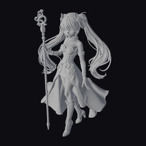 Detailed in every aspect, this anime-style figurine showcases a girl with a captivating smile, dressed in a vibrant pink dress that flows elegantly behind her. Her outfit is complemented by knee-high boots and a staff that adds to her magical aura. The figurine’s long, dark hair with pink highlights cascades down her back, creating a dynamic visual effect. The intricate details, from the texture of her dress to the accessories, make this model perfect for various applications, including games, 3D printing, VR/AR experiences, animation, and design projects. The model’s unique features and high-quality design ensure it stands out in any context.