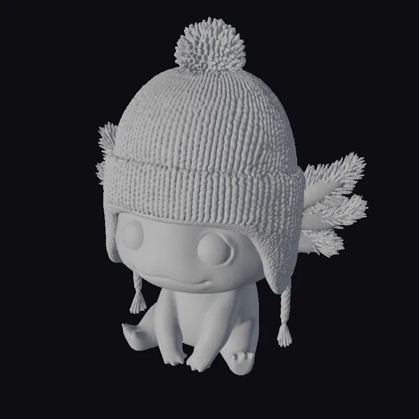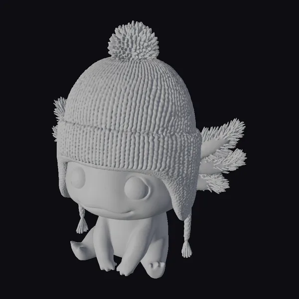 Detailed with precision, this stylized pink axolotl sits poised, its body a soft pink hue that contrasts beautifully with the bright blue of its knit hat. The hat itself is a masterpiece of texture, complete with a white pom-pom atop and blue tassels that dangle from the sides, each strand meticulously rendered. Red and white accents on the axolotl’s gills add a pop of color, drawing the eye to the creature’s unique features. Its large, black eyes are full of warmth and friendliness, inviting the viewer to engage. This model is perfect for use in animation, game development, or as a decorative piece in 3D design projects, offering a touch of whimsy and delight.