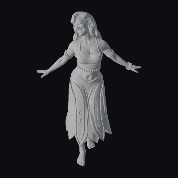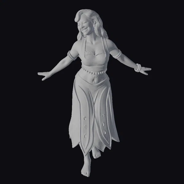 This stunning belly dancer model is posed in a dynamic stance, arms outstretched and feet bare, as if caught mid-performance. Her pink and gold costume is intricately detailed, with ornate patterns and jewelry that catch the light. The stylized rendering emphasizes her expressive features and fluid movement. Ideal for use in games, animation, or 3D printing, this model brings a touch of exotic elegance to any project. The detailed textures and realistic proportions ensure a high level of realism, making her a versatile asset for various applications.