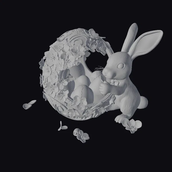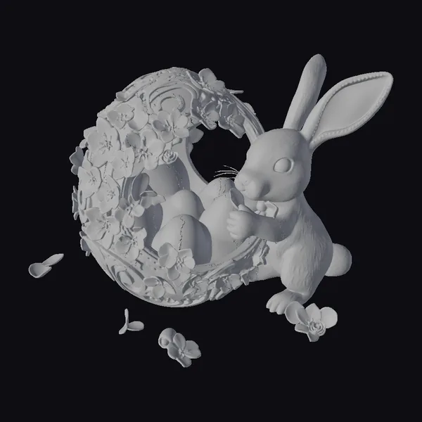 In a tender moment, the pink bunny gently holds onto the edge of its ornate golden eggshell, now bursting with cherry blossoms. The bunny’s pose showcases its large, expressive ears and detailed whiskers, set against a backdrop of scattered blossoms. The golden shell, adorned with swirling patterns, contrasts beautifully with the soft pink hues of the bunny and flowers. This model is perfect for use in animations, games, or as a decorative element for Easter-themed projects, offering a blend of fantasy and seasonal charm.