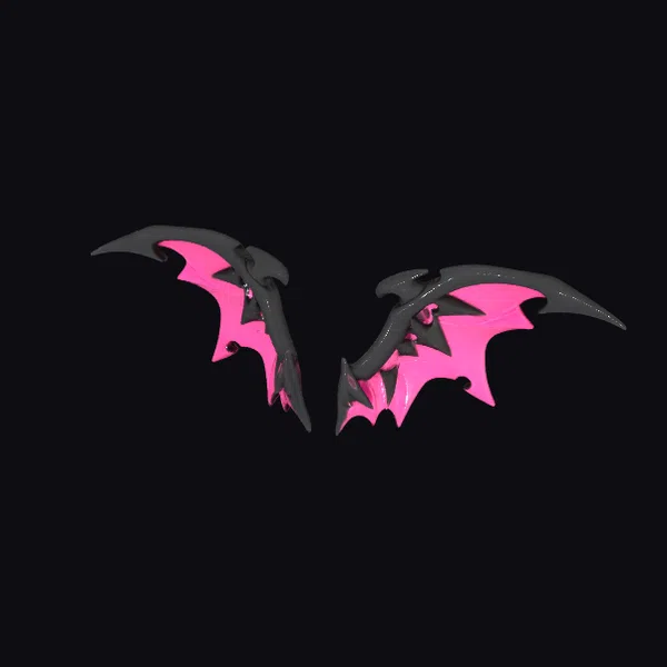 Perched in a dynamic pose, these pink demonic bat wings are set against a stark white background, showcasing their intricate details. The wings’ membranes are a vibrant pink, while the edges and structural parts are a glossy black, suggesting a leathery texture. The wings’ shape is asymmetrical, with a more pronounced curve on the upper edge, giving them a menacing yet alluring appearance. The pink coloration has a slightly pastel quality, adding a touch of whimsy to the overall dark fantasy vibe. These wings would be perfect for adding a touch of gothic elegance to character designs, costumes, or even 3D animations and games.