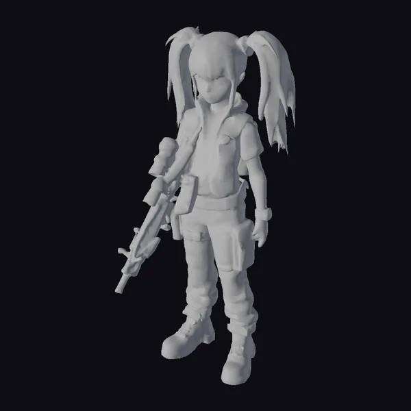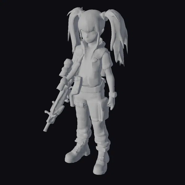 Detailed with precision, this stylized character boasts a striking pink hairstyle styled in twin ponytails, paired with a uniquely designed outfit that’s a kaleidoscope of colors and patterns. The character grips a substantial machine gun, adding an edgy contrast to the otherwise playful and cartoonish appearance. The intricate details, from the texture of the clothing to the design of the weapon, make this model a standout. Ideal for projects requiring a character with a bold, eye-catching aesthetic, such as animations, games, or designs that blend cute and dangerous elements.