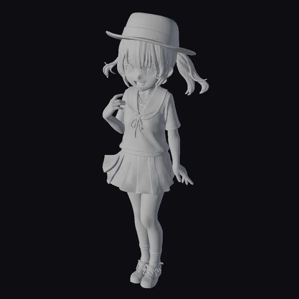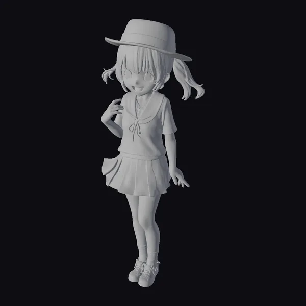 Detailed with precision, this anime-style character model showcases a young girl with a cheeky grin and sparkling blue eyes that seem to dance with mischief. Her pink hair is styled in pigtails, adding to her youthful and lively appearance. She wears a distinctive red sailor shirt with blue and white accents, paired with a short gray pleated skirt, knee-high socks, and brown shoes, completing her schoolgirl look. The addition of a pink hat and black gloves adds a touch of whimsy and elegance. This model is perfect for projects requiring a vibrant, dynamic character, such as animations, games, or virtual reality experiences.