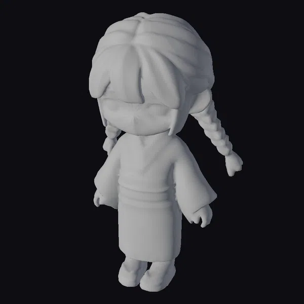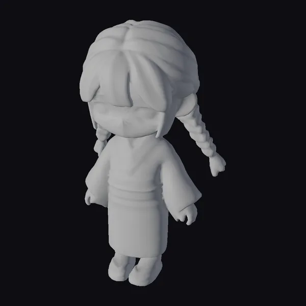 Detailed in a chibi style, this character model showcases a young girl with a captivating presence. Her pink kimono is intricately designed with floral motifs, complemented by a striking red obi and matching geta sandals. The model’s dark hair is styled in two long braids, enhancing her youthful and lively appearance. The gentle lighting accentuates her smooth, rounded features and expressive brown eyes. Ideal for use in animations, games, or virtual environments where a touch of anime charm is desired, this model brings a delightful character to life.