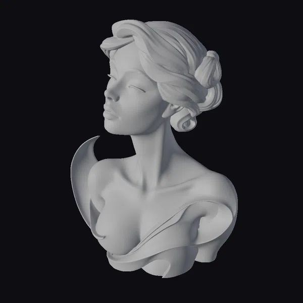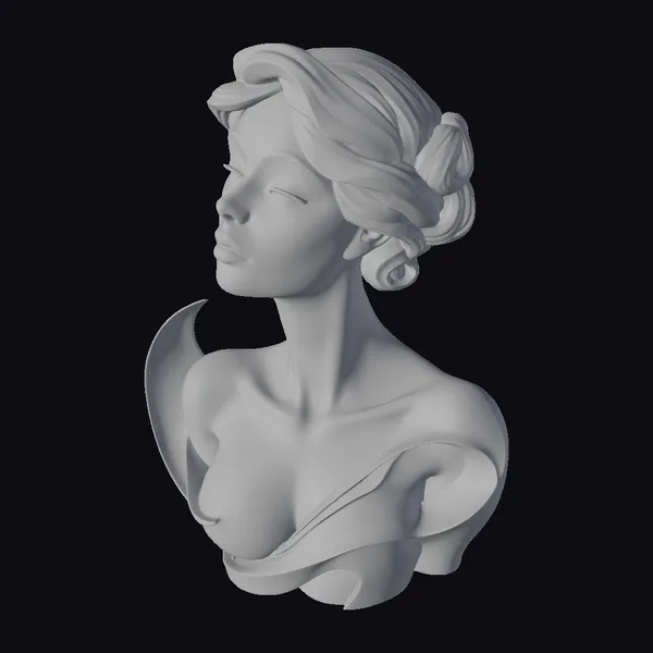 This stunning pink metallic female bust is a masterpiece of modern sculpture. The model is posed with her head turned to the side, showcasing her elegant updo and serene facial expression. The metallic finish gives the sculpture a shiny, reflective surface that catches the light, highlighting the intricate details of her curly hair and smooth skin. The bust is a perfect blend of style and elegance, making it an ideal addition to any modern decor or art collection. Its high-quality design and precision make it suitable for various applications, including 3D printing, animation, and virtual reality.