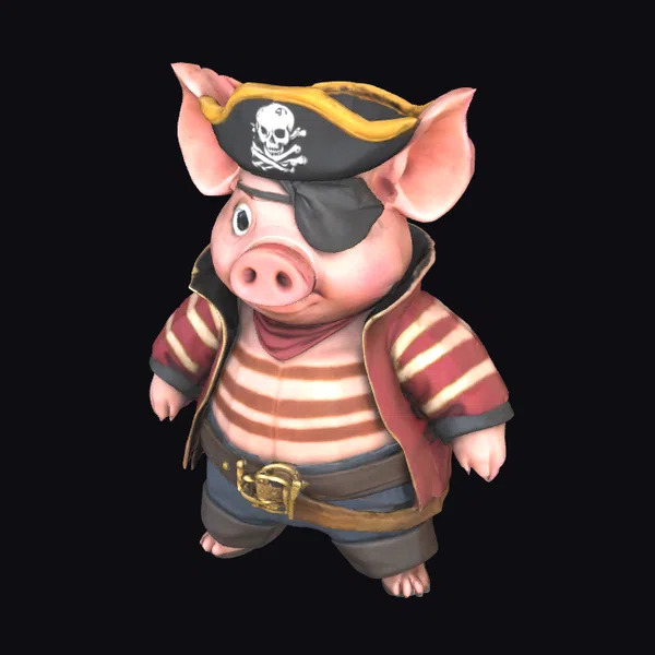 In a dynamic A-pose, this cartoon pig pirate stands confidently, its pink skin and large ears a testament to its endearing nature. The character’s facial features are meticulously detailed, with a black eye patch and a pirate hat adorned with a white skull and crossbones. The outfit consists of a red and white striped shirt, a red jacket with gold accents, and a brown belt with a gold buckle. The model’s high level of detail and realistic textures make it perfect for various applications, including game development, animation, and print projects.