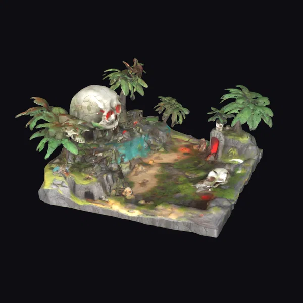 Deep within the heart of a mystical archipelago lies a fabled island, teeming with secrets and hidden riches. This intricately designed 3D model captures the essence of a pirate’s treasure map, featuring a colossal skull-shaped rock formation, its empty eye sockets glowing with an otherworldly red light. The island’s landscape is dotted with palm trees, their leaves swaying gently in the breeze, while a meandering path invites exploration. A small cave entrance and a scattering of bones add to the sense of mystery and peril. This model is perfect for use in games, animations, or 3D printing, offering a unique and captivating setting for any pirate-themed project.