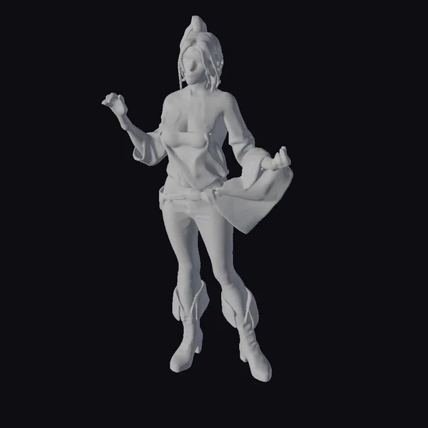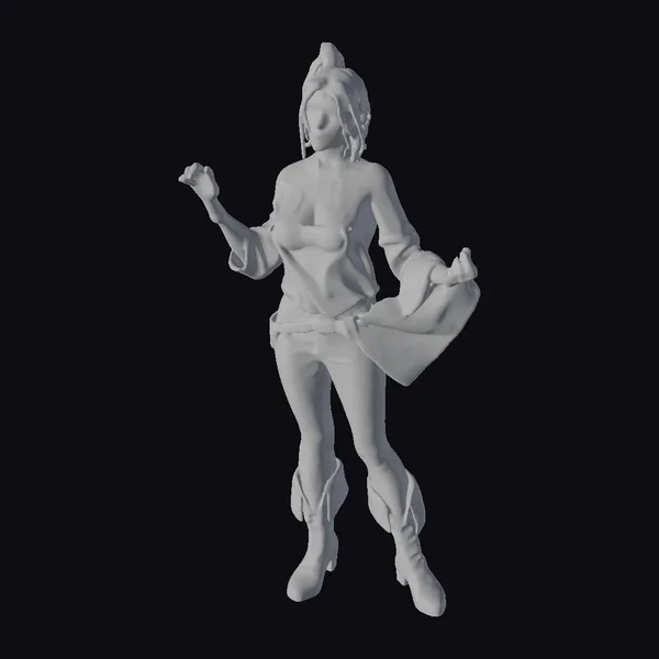 Detailed from her tousled blond locks to her rugged boots, this stylized pirate woman exudes a sense of fearless adventure. Her sheer pirate shirt flows dynamically, revealing a tantalizing glimpse of her outfit beneath. With one hand raised and the other at her side, she strikes a pose that commands attention. Her tanned skin and bold demeanor make her a compelling character for any fantasy or pirate-themed project. Perfect for use in games, animation, 3D printing, or VR/AR experiences, this model brings a touch of pirate chic to any scene.