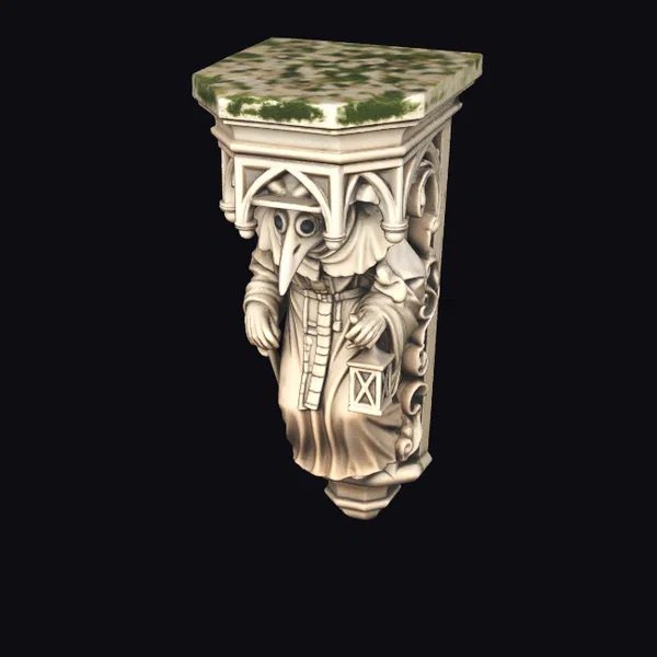 This intricately designed console features a gargoyle carved in the likeness of a plague doctor, complete with a distinctive beaked mask and flowing robes. The figure stands proudly beneath a flat, moss-covered top, which appears as if nature is slowly reclaiming it. The gargoyle’s pose, with one hand on a lantern, suggests it’s a guardian of secrets or a watcher of the night. Crafted with attention to detail, from the texture of the stone to the subtle shading on the mask, this piece would be a stunning addition to any environment, whether in games, animation, or as a design element. Its unique blend of historical and fantastical elements makes it perfect for projects aiming to evoke a sense of mystery or foreboding.