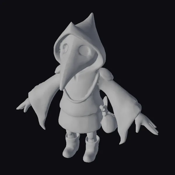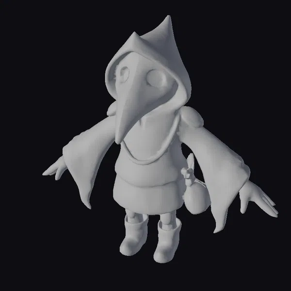 Standing tall with an air of mystique, the plague doctor’s puppet form is a marvel of detailed craftsmanship. Its blue hooded cloak flows around its body, complemented by a long, pale beak-like mask that covers its face, adding to its enigmatic presence. The figure’s hands are outstretched, palms up, as if in a gesture of supplication or explanation. A pouch hangs at its side, suggesting it’s prepared for a journey into the depths of a mysterious world. The model’s textures are rich and detailed, with clear indications of fabric and material, making it perfect for use in games, 3D printing, VR/AR experiences, animation, and design projects where a touch of dark fantasy is required.