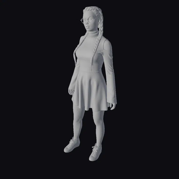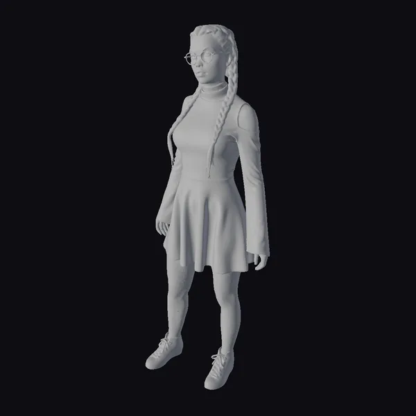 Detailed in every aspect, this 3D model showcases a young woman with a distinctive style, starting with her long white braids that cascade down her chest, paired with stylish glasses that add an intellectual touch. The red and black plaid dress, with its cold shoulders and flared hem, is a focal point, accentuating her youthful and vibrant persona. The outfit is completed with fishnet tights and black sneakers, giving her a casual yet fashionable appearance. The model’s pose and expression convey a sense of confidence and approachability, making her a versatile character for various creative projects. Whether it’s for animation, game development, or virtual reality experiences, this model is designed to bring characters to life with its intricate details and stylized aesthetic.