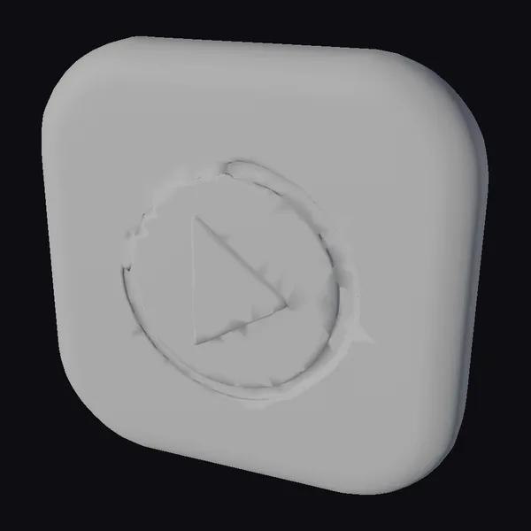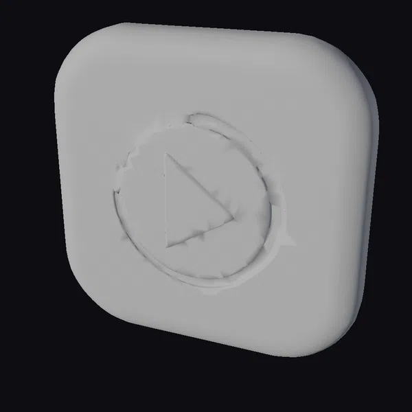 Floating dynamically in a 3D space, this play button icon model showcases a dark gray, rounded square shape with a slightly raised edge, giving it a soft, modern aesthetic. The button’s surface is adorned with a large, white play icon encircled by a subtle, raised ring, adding depth to the design. A small dot to the right of the play icon adds a touch of detail. The model’s clean lines, smooth curves, and balanced proportions make it perfect for various applications, including video players, media interfaces, and digital platforms. Its versatility allows it to be used in games, animations, VR/AR experiences, and design projects, making it an essential asset for creators.