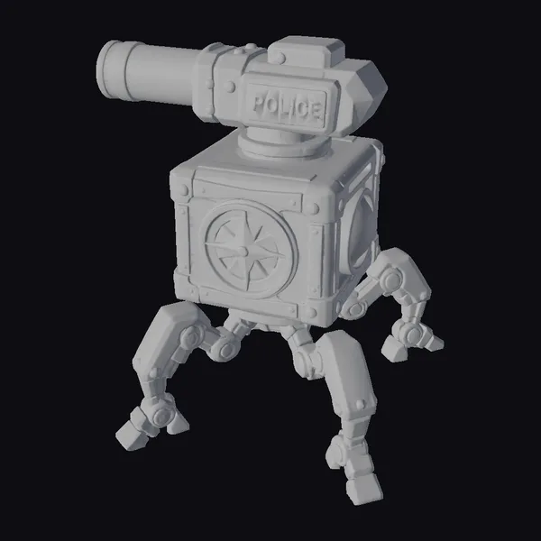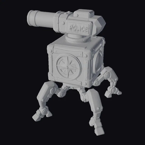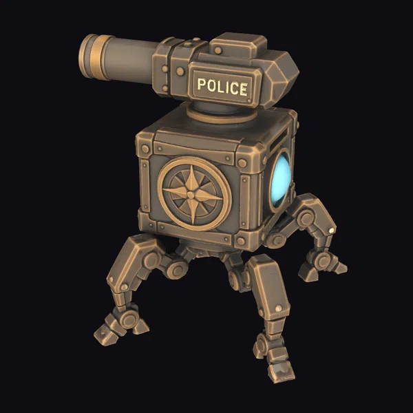 Perched atop a square body, the robot’s turret rotates dynamically, giving it a sense of constant vigilance. The body itself is adorned with metallic plates, bolts, and a stylized compass rose, adding to its industrial aesthetic. A bright blue eye glows on one side, while the ‘POLICE’ label on top leaves no doubt about its purpose. This robot’s design makes it perfect for sci-fi scenes, games, or animations where a futuristic law enforcement presence is needed. Its detailed design and metallic textures bring a sense of realism to any project.