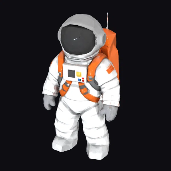 Detailed with precision, the astronaut’s suit is a marvel of polygonal design. The white and orange hues contrast sharply with the gray gloves and helmet, creating a visually striking effect. The model’s pose, with arms slightly bent, suggests readiness for action. The backpack, complete with antennae, adds to the authenticity. This model is perfect for projects requiring a futuristic, stylized astronaut, such as animations, games, or virtual reality experiences.