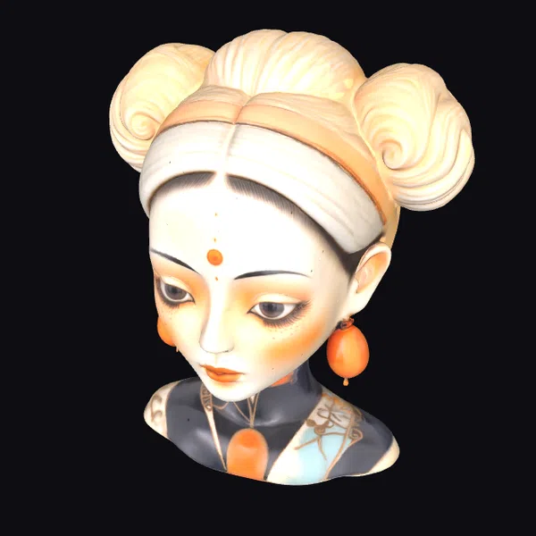 This stunning porcelain doll bust presents a captivating blend of detailed artistry and serene elegance. The doll’s head is crowned with a beautifully styled updo, from which a few loose strands elegantly frame her face. Her skin has a smooth, slightly luminous quality, suggesting the delicate finish of fine porcelain. The doll’s facial features are meticulously rendered, with expressive eyes, subtle eyebrows, and a gentle smile. Adorning her are vibrant orange earrings and a matching pendant, adding a pop of color against her more subdued complexion and dark, high-collared attire. The intricate patterns on her clothing and the delicate jewelry highlight the artisan’s attention to detail. This model is perfect for use in games, 3D printing, virtual reality (VR) or augmented reality (AR) experiences, animations, or as a design reference. Its high level of detail and realistic appearance make it suitable for projects requiring a touch of elegance and refinement.