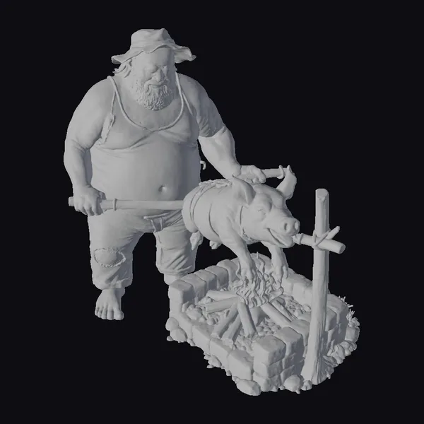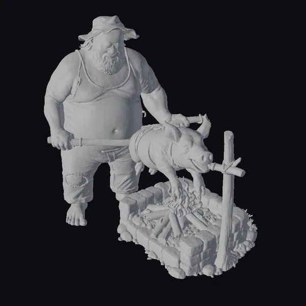 Imagine stepping into a serene backwoods setting where the air is filled with the mouthwatering aroma of roasting pork. This detailed 3D model showcases a stout man, clad in a simple tank top and bucket hat, expertly managing a rotisserie-style pig roast over a brick-lined fire pit. The pig, positioned on a metal spit, appears ready to be devoured, its skin glistening with a golden-brown sheen. The man, with a satisfied smile, seems to be in the midst of preparing a grand feast. The scene is rich with textures: from the rough-hewn bricks of the fire pit to the rustic wood of the spit, and not least, the tender look of the pig. This model is perfect for projects requiring a rustic, outdoor cooking scene, suitable for animations, games, or architectural visualizations aiming to add a touch of realism or stylized charm.