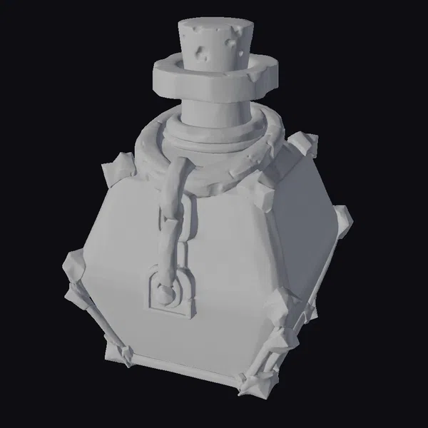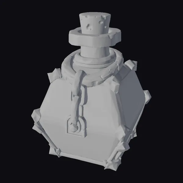 In a mesmerizing blend of fantasy and alchemy, this potion bottle stands out with its unique teal body, accented by brown details and a robust chain wrapped around its neck. The bottle’s stopper, crafted to resemble a cork, adds to its authentic look. A silver chain and lock dangle from the bottle’s front, suggesting the preciousness of its glowing orange contents. The bottle’s shape, reminiscent of a shield, is secured with metal spikes at each corner, enhancing its mystical and somewhat ominous appearance. This model is perfect for use in games, 3D printing, VR/AR experiences, animations, and designs where a touch of magic and mystery is required.
