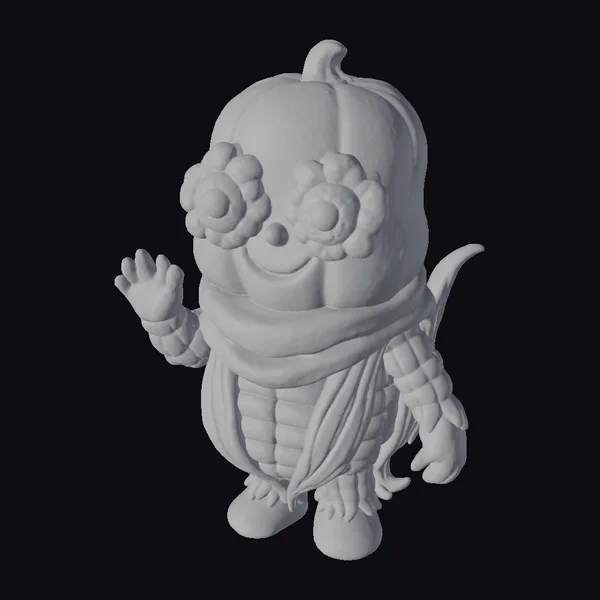 Standing with a friendly wave, this stylized pumpkin character is meticulously detailed with a brown stem on its head, large expressive eyes made of flowers, and a joyful smile. The body of the character is designed to look like an ear of corn, complete with green leaves and a yellow and brown husk. The combination of the red scarf and flower eyes adds a touch of charm and friendliness. This model is ideal for use in animations, games, or as a decorative piece for harvest-themed projects. Its unique design makes it a standout addition to any 3D environment, especially those that require a seasonal or whimsical touch.