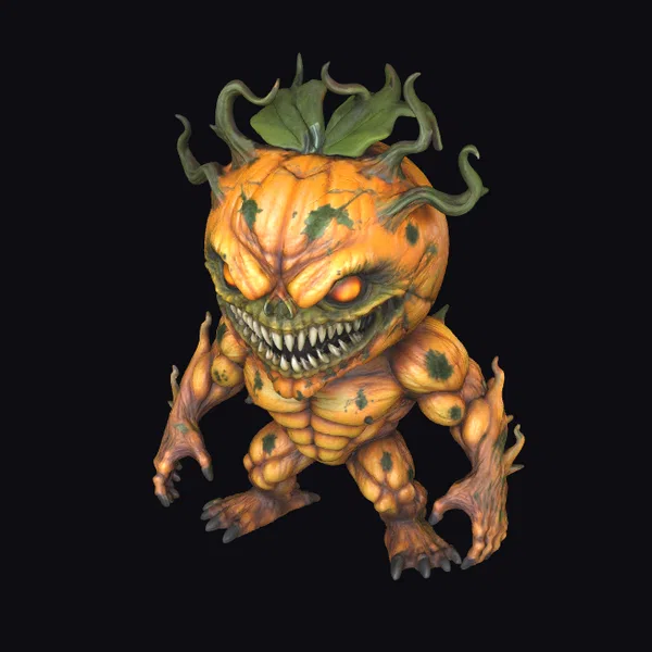 Standing menacingly with a wide stance, this pumpkin fiend boasts an imposing physique, with bulging muscles suggesting incredible strength. The surface of its body is a mass of orange and green, with darker spots and twisted, vine-like protrusions adding to its grotesque appearance. The face is a masterclass in horror, with sharp, white teeth and glowing orange eyes that seem to pierce through darkness. The top of its head is adorned with green leaves and twisting vines, giving it a crown-like appearance. This model is perfect for adding a touch of Halloween horror to games, animations, or 3D prints. Its unique design ensures it will stand out in any scene, from horror animations to fantasy games.