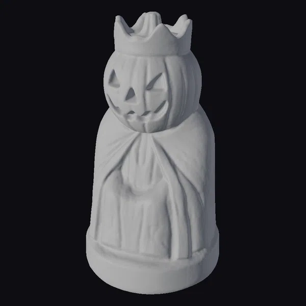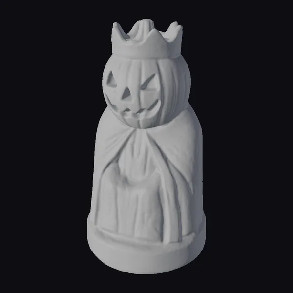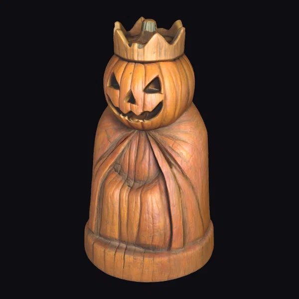 The Pumpkin King statue stands out with its meticulously carved pumpkin head, sporting a cheerful face with triangular eyes and a wide, toothy grin. Perched atop the pumpkin is a delicate, crown-like structure, adding a touch of royalty to the figure. The body of the statue is draped in a cape that flows elegantly, mimicking the folds of a royal garment. The entire piece is crafted to resemble carved wood, with textured details that bring out the ridges of the pumpkin and the intricate patterns of the cape. The statue’s base is sturdy, ensuring it stands firm. This model is ideal for use in games, 3D printing, virtual reality experiences, animations, or as a design element in various creative projects, offering a versatile and eye-catching addition to any Halloween-themed setting.