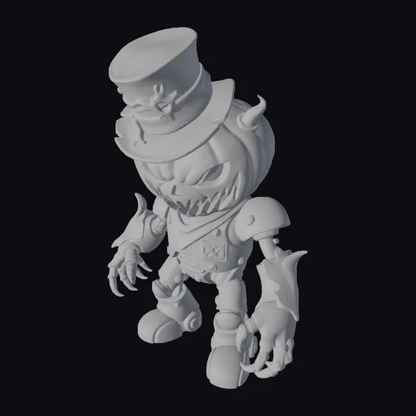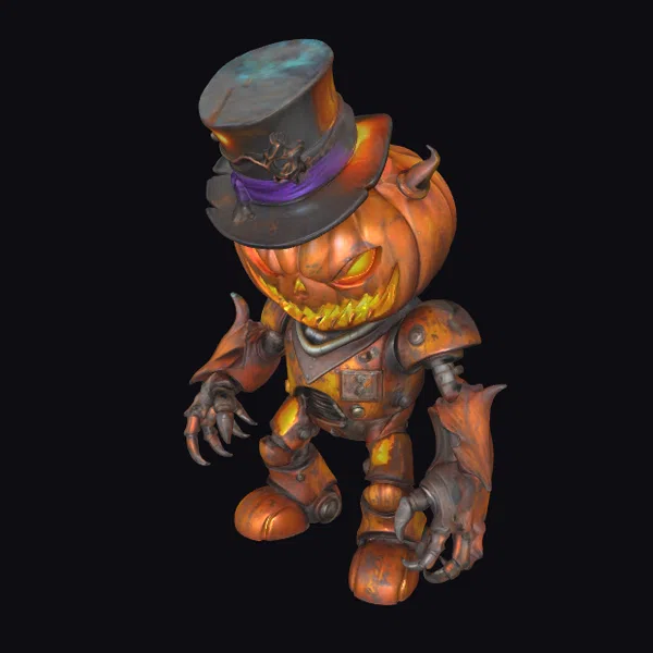 Gaze upon the intricate details of this pumpkin robot, from the textured surface of its pumpkin head to the metallic sheen of its mechanical body. The top hat, adorned with a purple band and a small, twisted figure, adds a touch of sophistication to the character’s otherwise menacing appearance. The glowing yellow eyes and sharp teeth create an unsettling contrast to the model’s whimsical demeanor. This character model is perfect for projects that require a blend of fantasy and technology, such as animations, games, or virtual reality experiences. Its unique design ensures it will stand out in any scene, evoking a sense of wonder and unease.