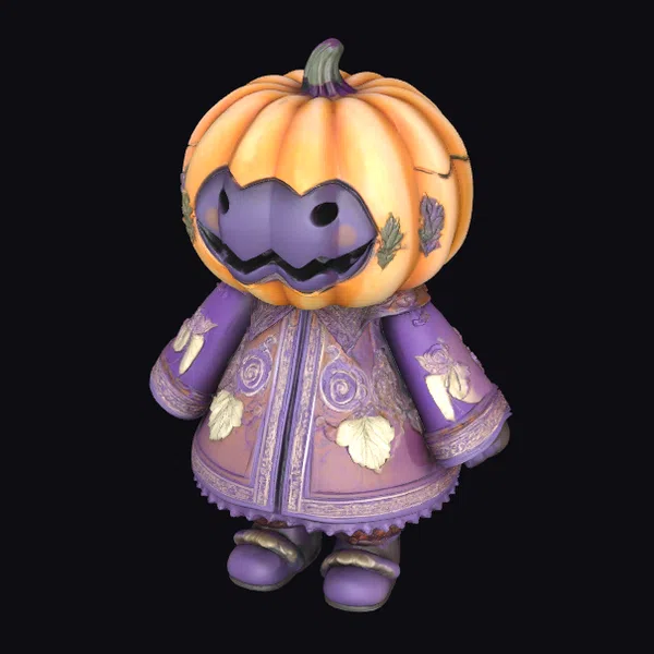 Detailed with precision, this stylized pumpkin character stands out with its vibrant orange pumpkin head, complete with a green stem and a cheerfully carved purple face. The figure’s purple robe is richly textured with golden details and white leaf motifs, adding a regal touch to its appearance. The character’s pose is relaxed, with hands slightly bent, as if ready to engage in a festive dance. The model is meticulously crafted with high-quality textures and lighting effects, making it ideal for use in games, 3D printing, VR/AR experiences, animations, and design projects. Its unique blend of Halloween spirit and royal elegance ensures it will be a standout in any scene.