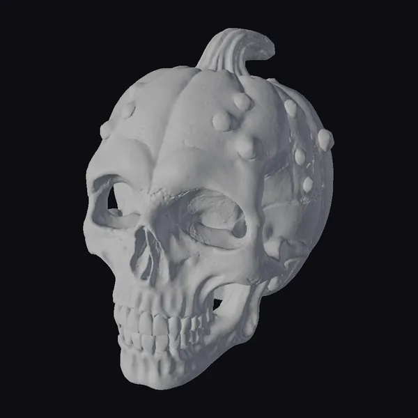 Intricately designed with a blend of organic and skeletal features, this pumpkin skull boasts a twisted stem and numerous spikes protruding from its surface. The eye sockets and mouth are hollowed out, adding to the eerie effect. The teeth are sharply defined, contributing to the overall menacing appearance. This model is ideal for use in games, 3D printing, virtual reality experiences, animations, and designs that require a haunting Halloween-themed element. Its detailed texture and vibrant orange color make it a standout piece.