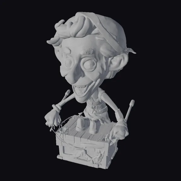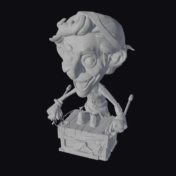 Perched on a wooden box adorned with mechanical details, this puppeteer figurine showcases a delightful blend of artistry and craftsmanship. His facial features are exaggerated, with large eyes and a wide smile, emphasizing his joyful demeanor. The character’s hands, each holding a tool, suggest he is in the midst of creating or manipulating puppets. The stylized, wooden texture of his body and clothes adds a rustic charm, while the overall design invites use in animation, games, or as a decorative piece. The puppeteer’s pose and expression evoke a sense of storytelling and creativity, making him a versatile asset for various projects.