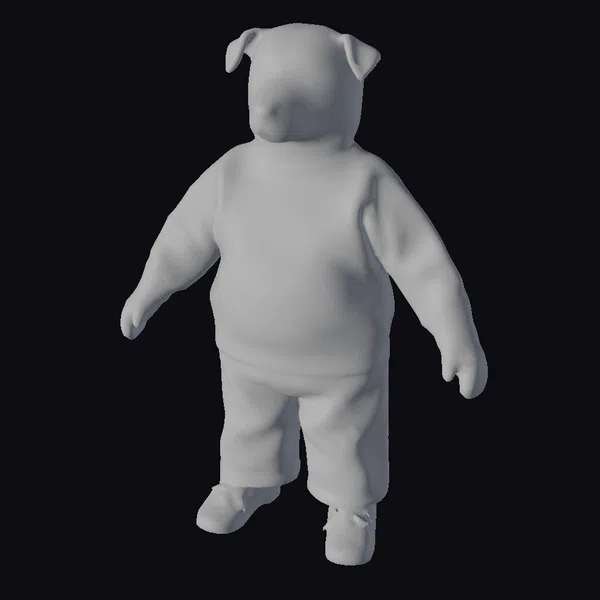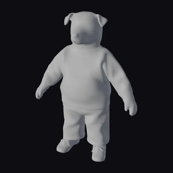 Standing with a relaxed posture, this stylized puppy model showcases intricate details such as a textured sweater, smooth pants, and laced shoes. The puppy’s facial features are endearingly cartoonish, with a slight smile and floppy ears. The model’s pose and expression evoke a sense of friendliness and approachability. Ideal for use in animations, games, or design projects where a cute and casual character is needed.